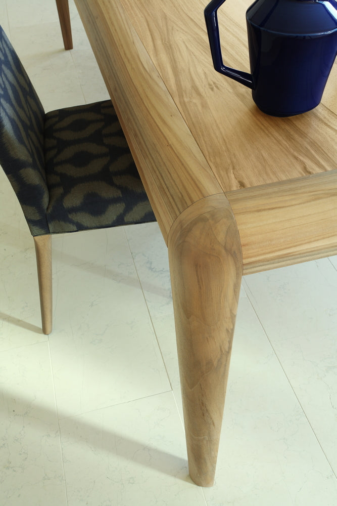 Il tavolo è valorizzato da una morbida cornice in massello di noce e completato da gambe massello della stessa essenza.