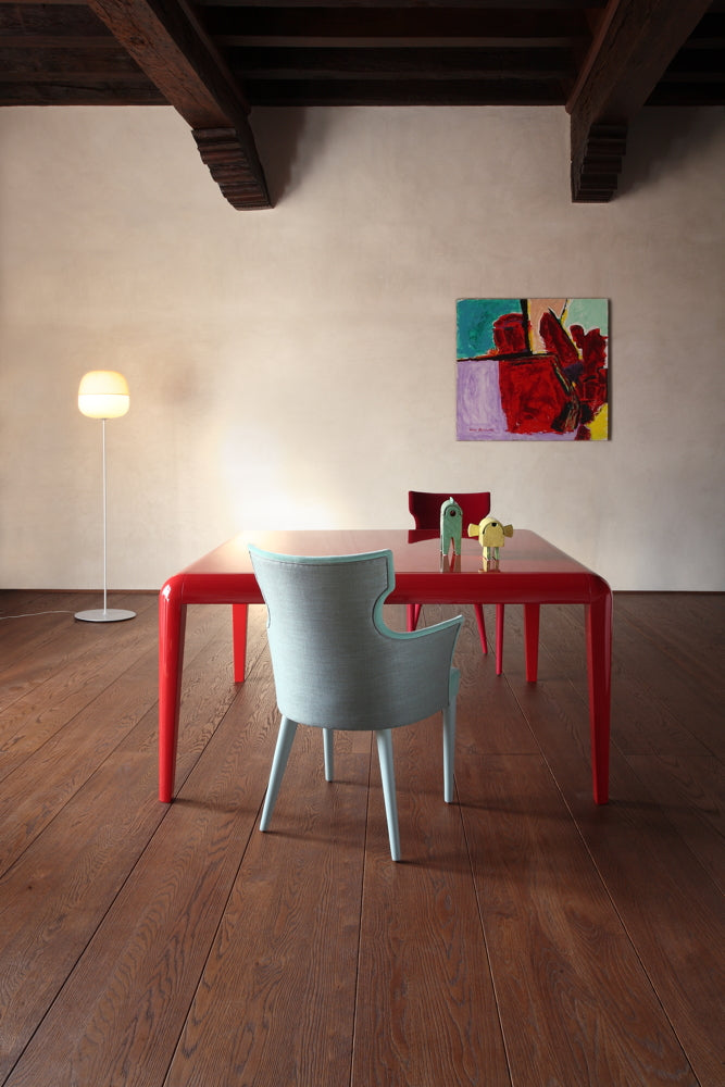 Tavolo da pranzo fisso caratterizzato da struttura di legno e acciaio, laccato lucido nelle 10 colorazioni 'Colli Casa'.