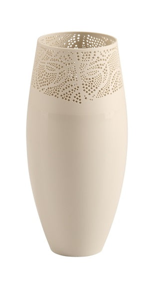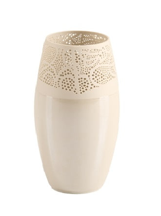 Vaso in fine porcellana bianca con decorazione a traforo e lustro trasparente.